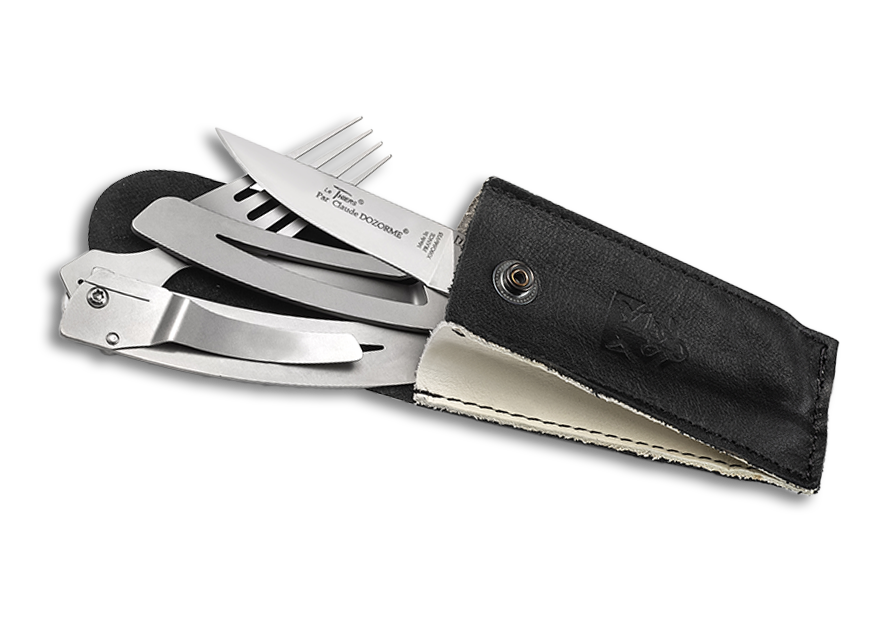 Vous déjeuner au bureau, dans la voiture ou bien encore sur l’herbe… La Maison Claude DOZORME a pensé à vous et vous propose un ensemble de fourchettes et cuillère pliantes pour accompagner les couteaux, et même un « Tout en 1 », prêt à vous servir dans n’importe quelle circonstance. Chaque produit a été conçu et est fabriqué dans les ateliers de la Maison Claude DOZORME à Thiers pour vous accompagner longtemps, très longtemps !