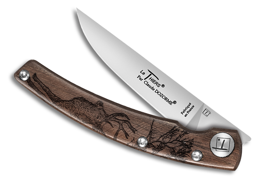 Le Thiers® Design de la Maison Claude DOZORME a prêté sa carcasse pour créer ce modèle inspiré par la nature. Le manche très ergonomique, en noyer, est gravé avec des motifs animaux inspirés par la faune et la flore de nos campagnes, un cerf, un chien, un sanglier, un lièvre et une bécasse, au milieu d’arbustes. La lame est fermement verrouillée en position ouverte grâce au système Liner-lock cher la Manufacture. Un caractère bien affirmé pour des ballades nature réussies !