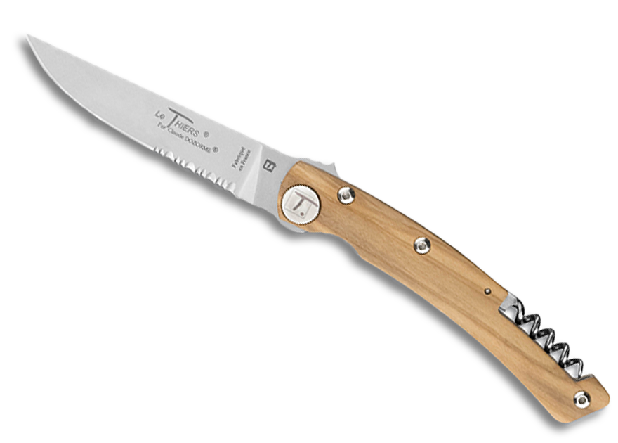 La Maison Claude DOZORME a intégré son savoir-faire en matière de sommelier sur ses couteaux pliants. Le Thiers® Tire-Bouchon en est une des plus belles expressions avec son design contemporain, ses lignes intégrant parfaitement le tire-bouchon, ses manches en bois d’olivier ou vallernia, ses lames à double denture… 4 modèles à découvrir. 6 modèles « Aventure » aux manches en aluminium peint complètent cette collection Le Thiers® Tire-bouchon.