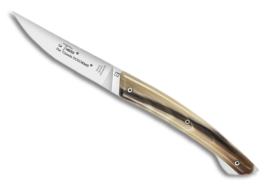 On n’a pas besoin de présenter le Laguiole dans la tradition des couteaux fermants. Fabriqué à Thiers depuis 150 ans, il est une icône parmi les icônes. La Maison Claude DOZORME a décliné sa version « Classique », avec une taille adaptée à la poche, le Tradi 12 cm, mais sait aussi se faire plus petit avec le modèle « Traditionnel », 9 cm. Et si vous ajoutez un tire-bouchon vous obtenez ce modèle emblématique, à la mèche conique parfaitement intégrée qui lui donne cet aspect rond et généreux que lui seul possède. Il devient alors le fidèle compagnon des randonneurs gastronomes les plus exigeants. Sobriété du design, pureté des lignes, chaleur des matériaux et qualité de fabrication française signent une série de couteaux intemporels.