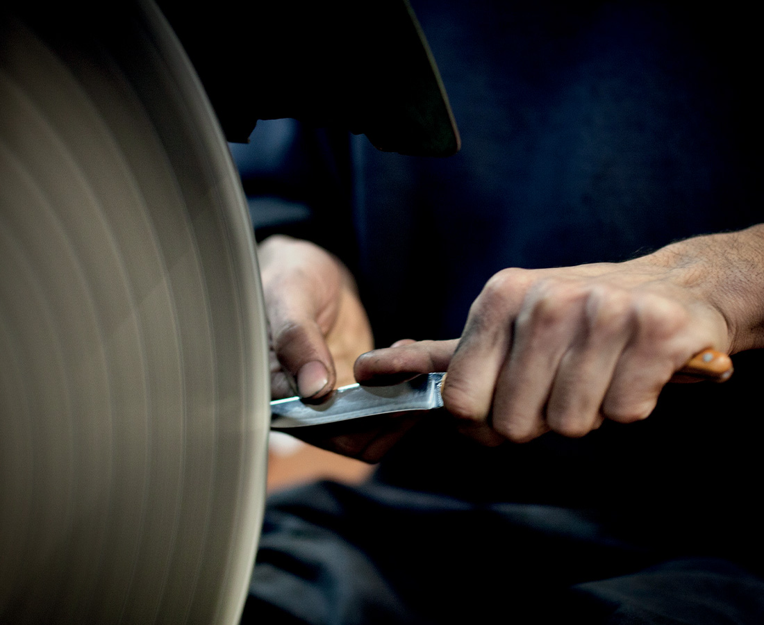 S’ensuit un contrôle de dureté puis direction l’émouture, étape qui consiste à usiner la lame par meulage pour lui donner sa forme en biseau. Elle permettra de donner la qualité de coupe du tranchant de la future lame puis sa longévité avec la possibilité de le réaffuter.