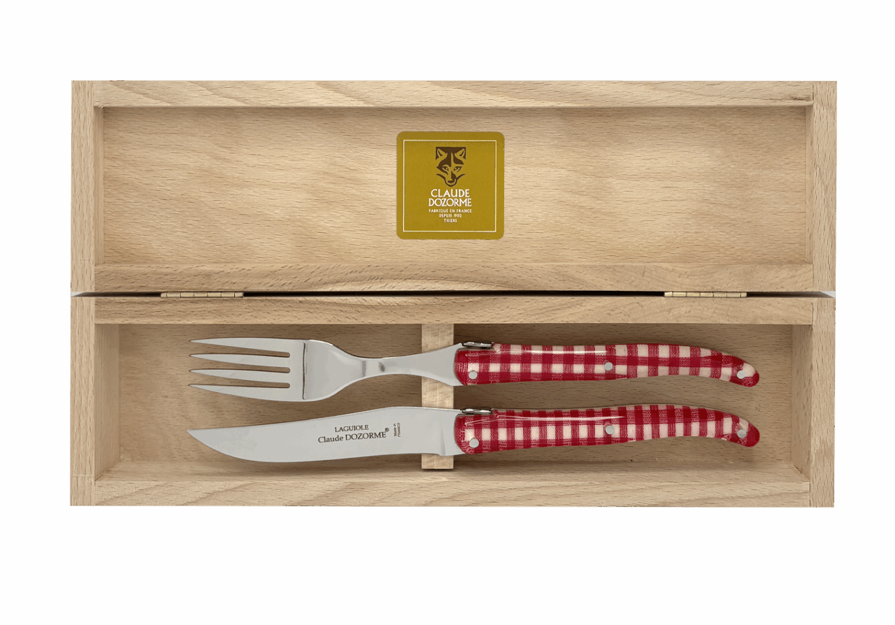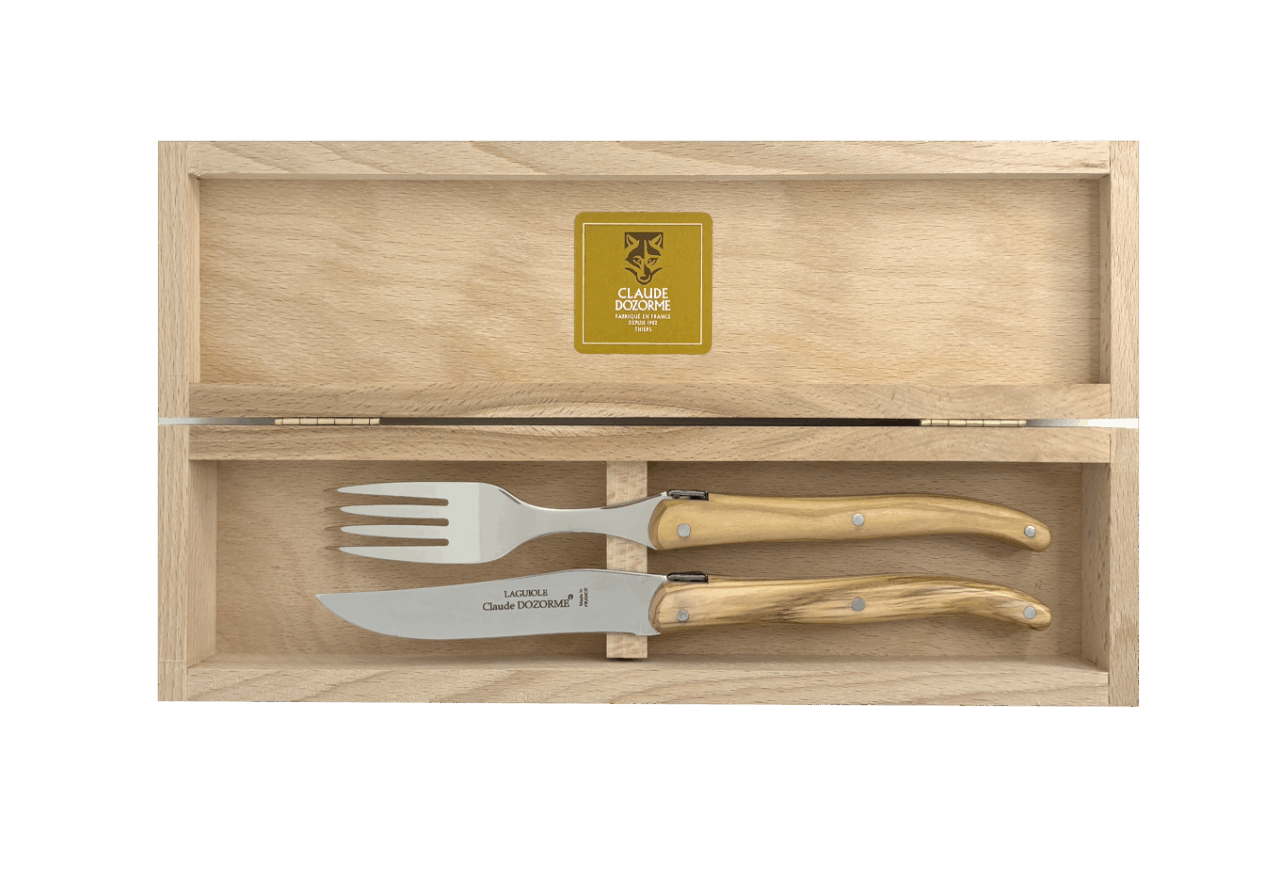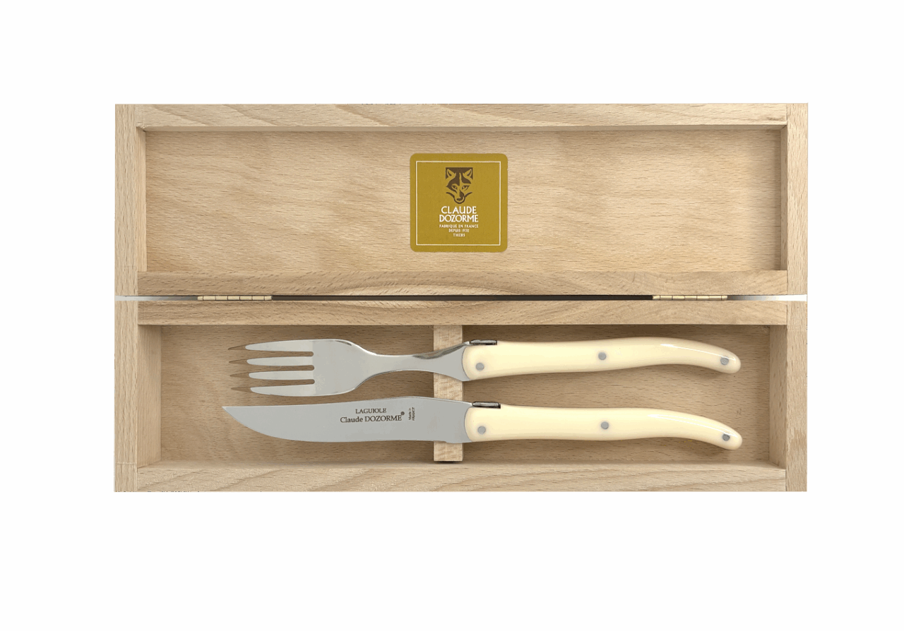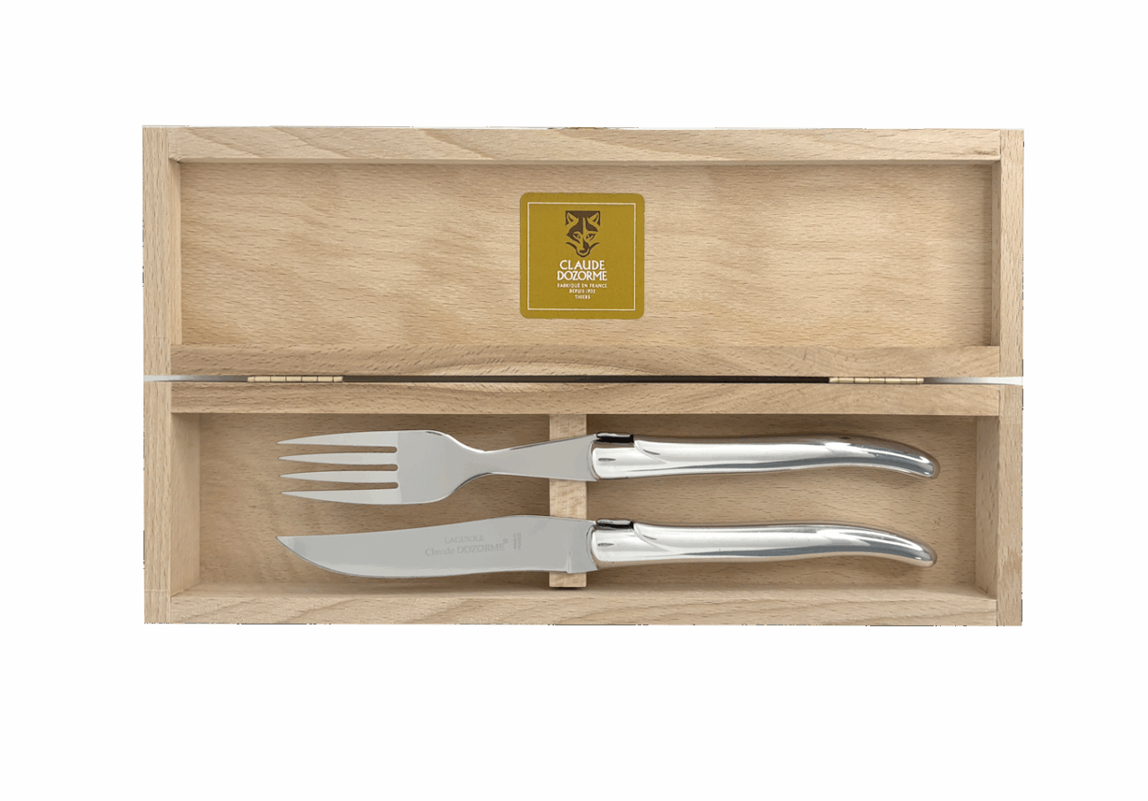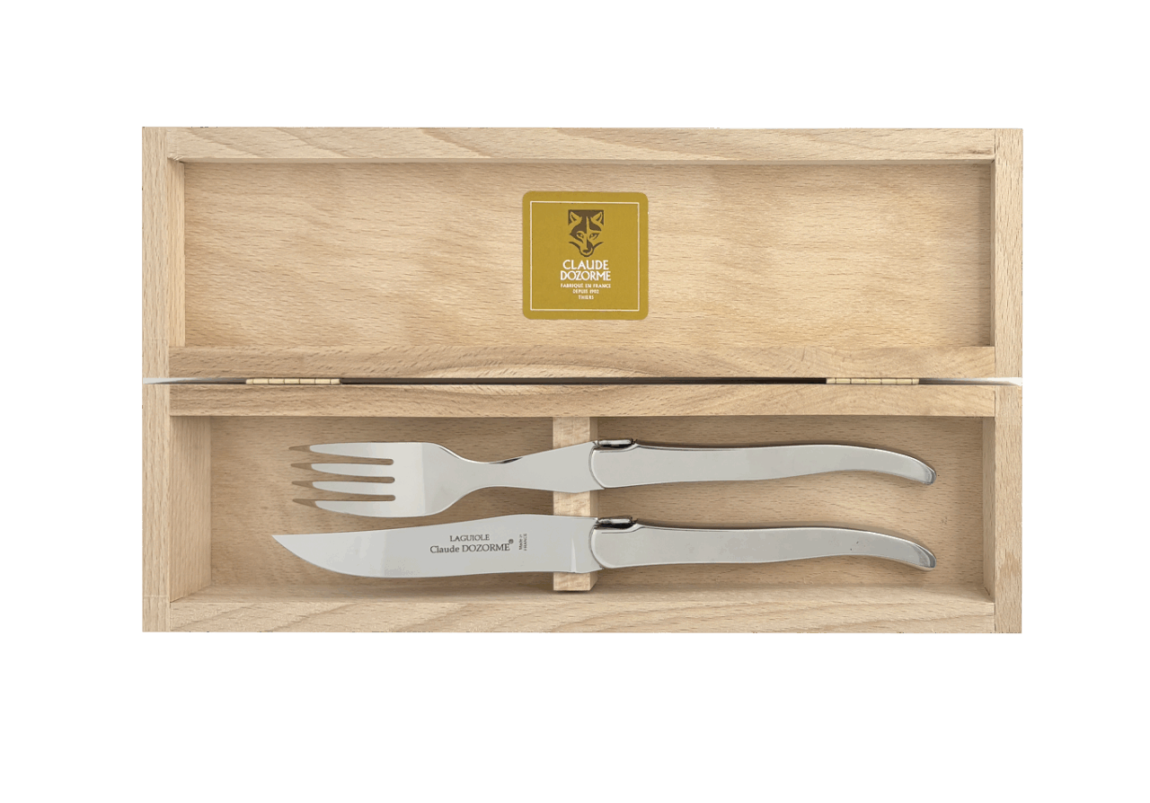 La lame plein manche – en acier spécial haut de gamme X50CrMoV15 (0,50% de carbone, 15% de chrome, 1% de molybdène et 1% de vanadium) garantit un excellent tranchant, une grande tenue de coupe et facilement réaffûtable. Fourchette acier 304L écroui.Fabrication 100 % française dans nos ateliers à Thiers.