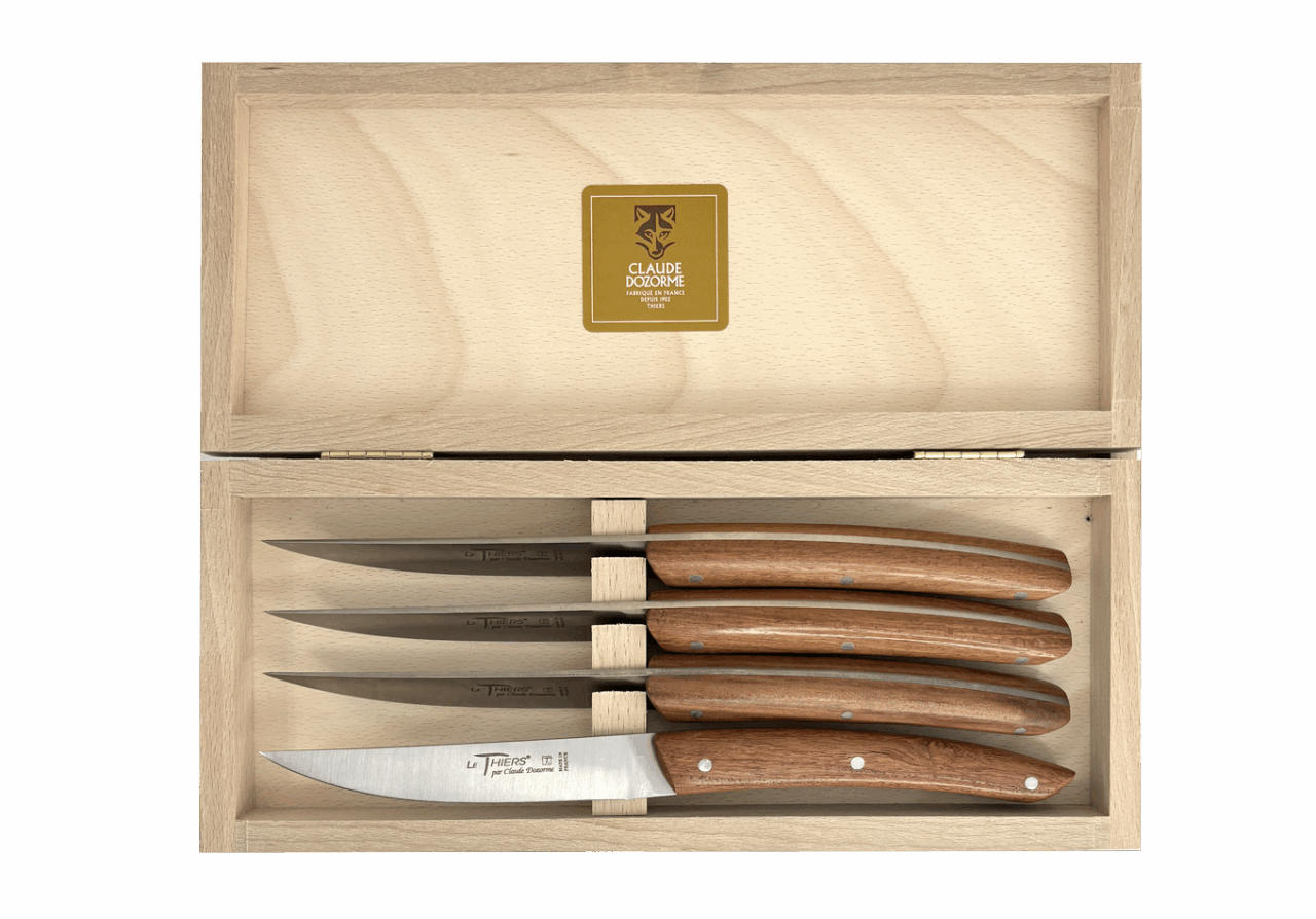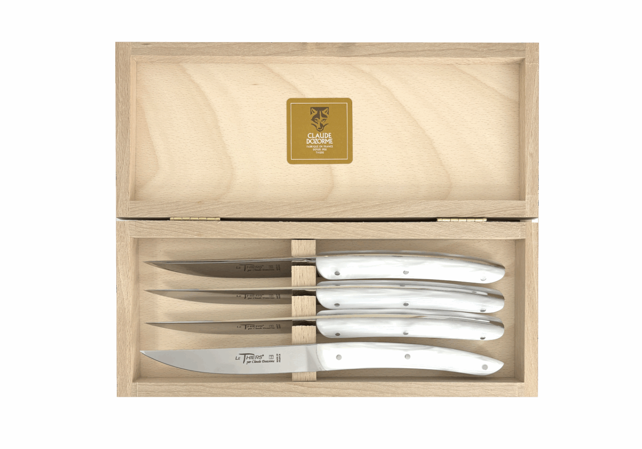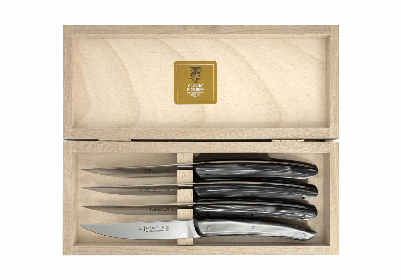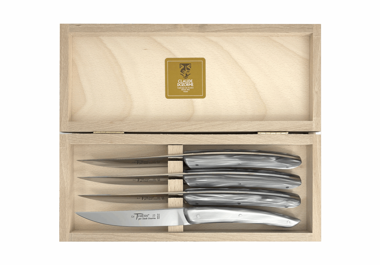 Forme emblématique de la coutellerie thiernoise, Le Thiers® est obligatoirement fabriqué localement. Claude DOZORME l'a décliné avec les codes de la Maison. Lignes fluides, détails épurés, matières nobles et qualité de fabrication, rendent ce couteau incontournable sur les tables contemporaines.