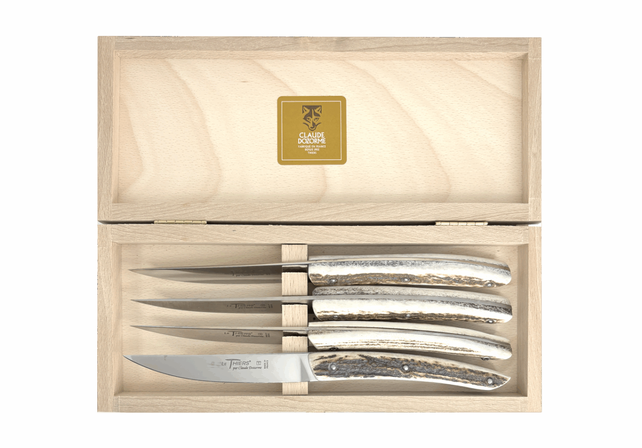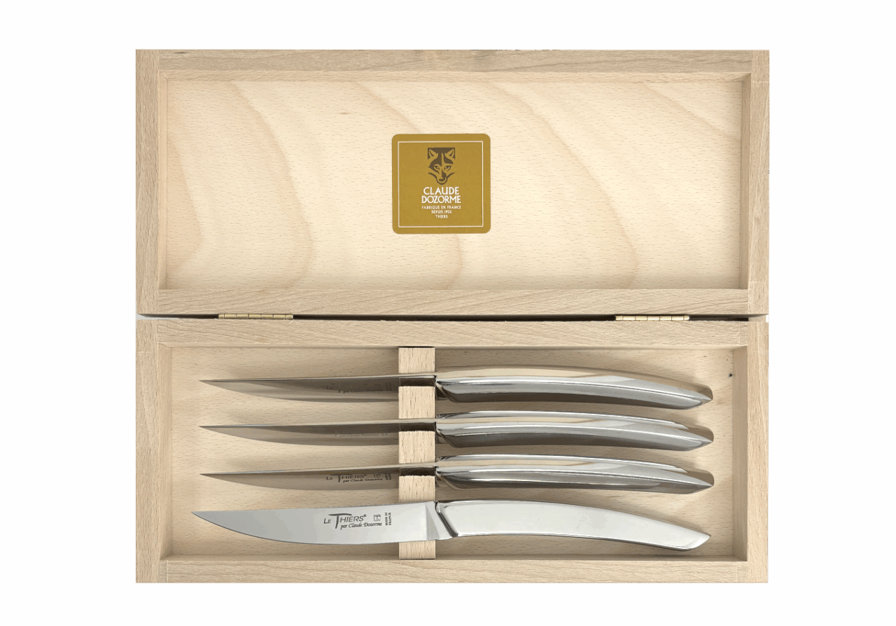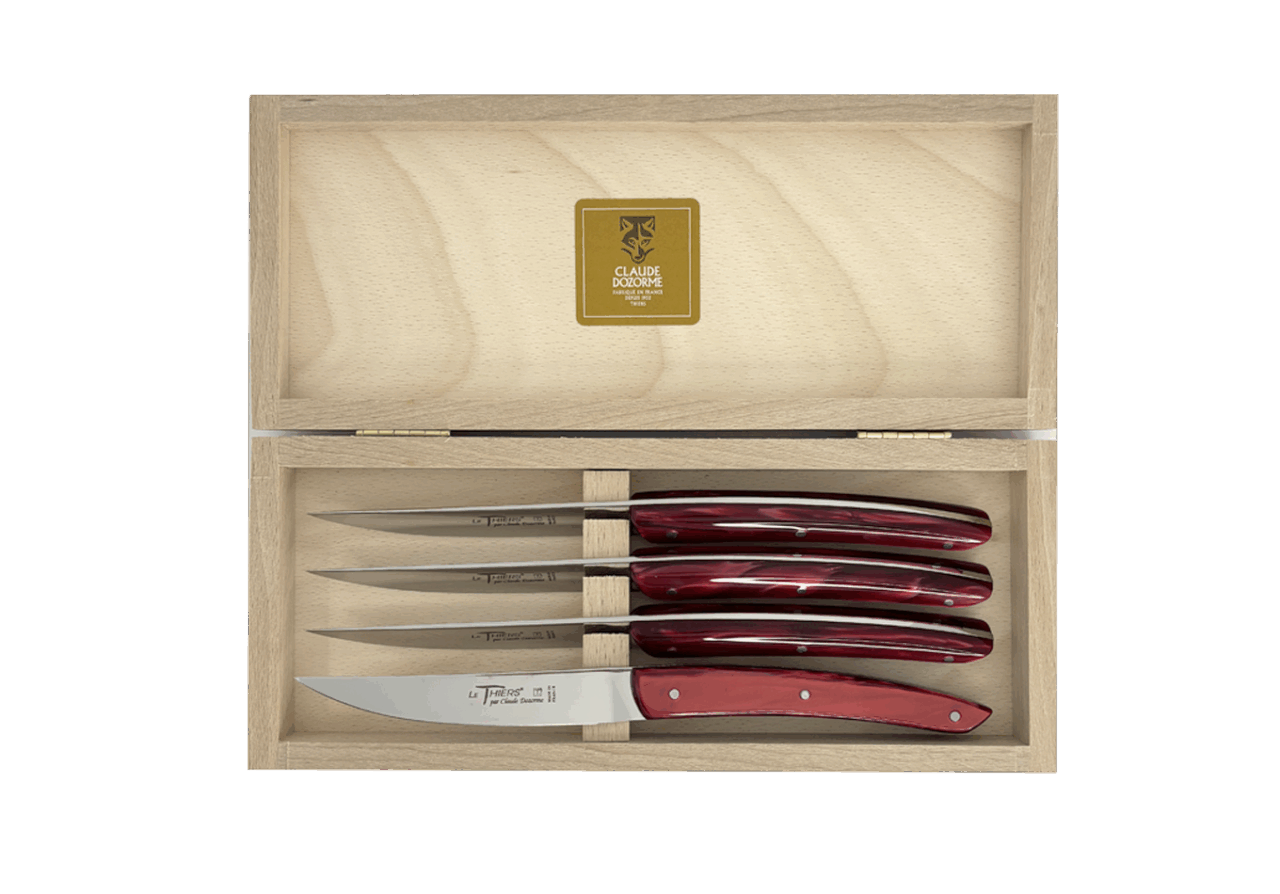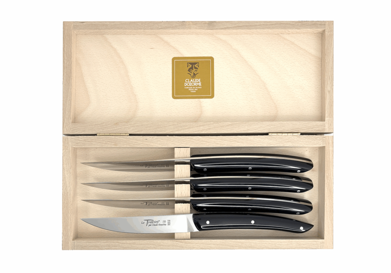 Forme emblématique de la coutellerie thiernoise, Le Thiers® est obligatoirement fabriqué localement. Claude DOZORME l'a décliné avec les codes de la Maison. Lignes fluides, détails épurés, matières nobles et qualité de fabrication, rendent ce couteau incontournable sur les tables contemporaines.