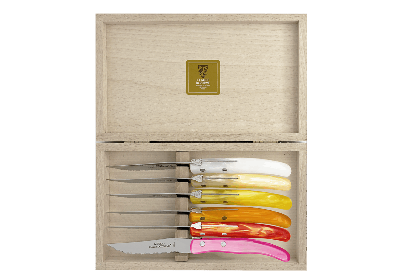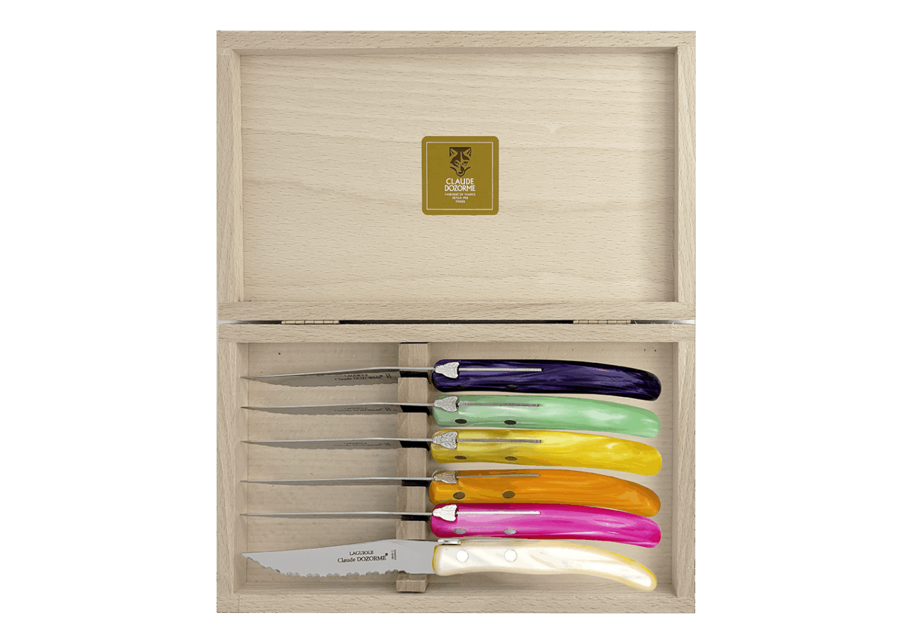 Dans une profusion de couleurs une dizaine de couteaux vous attendent pour préparer vos plats. Vous passez à table, quelle chance ! Les couverts et les services sont assortis ! Avec ce best-seller de la Maison Claude DOZORME, vous faites le choix de la gaieté, en cuisine comme à table, à un prix très doux et toujours avec la qualité « fabriqué en France ».