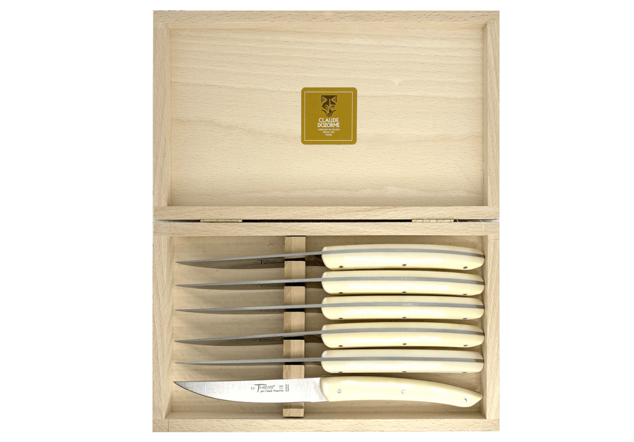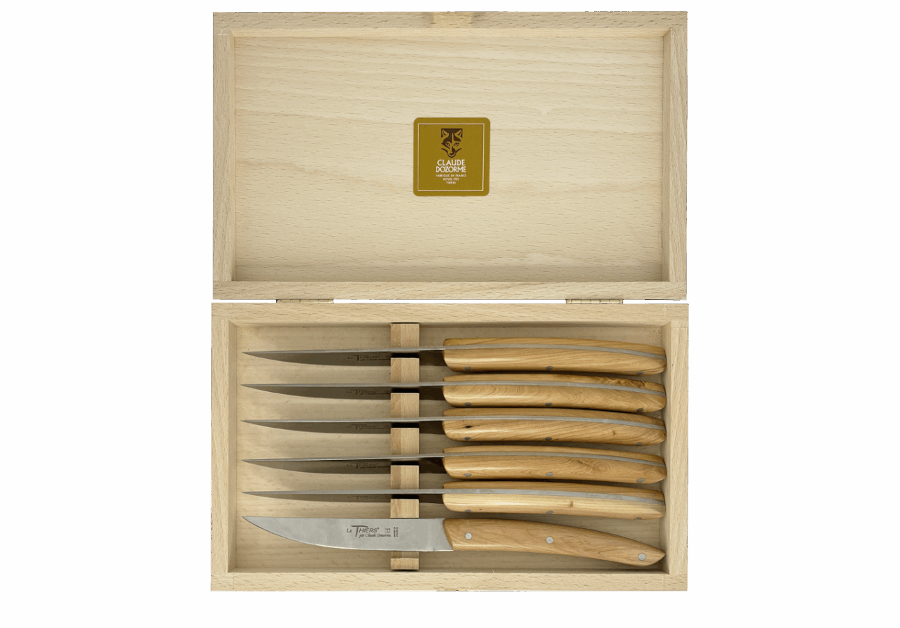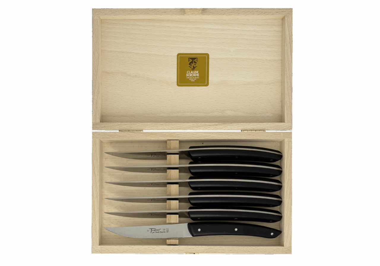 Forme emblématique de la coutellerie thiernoise, Le Thiers® est obligatoirement fabriqué localement. Claude DOZORME l'a décliné avec les codes de la Maison. Lignes fluides, détails épurés, matières nobles et qualité de fabrication, rendent ce couteau incontournable sur les tables contemporaines.