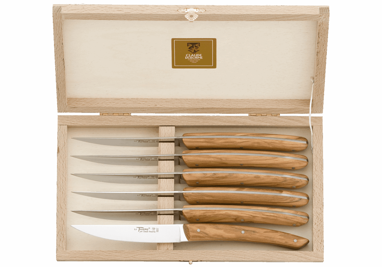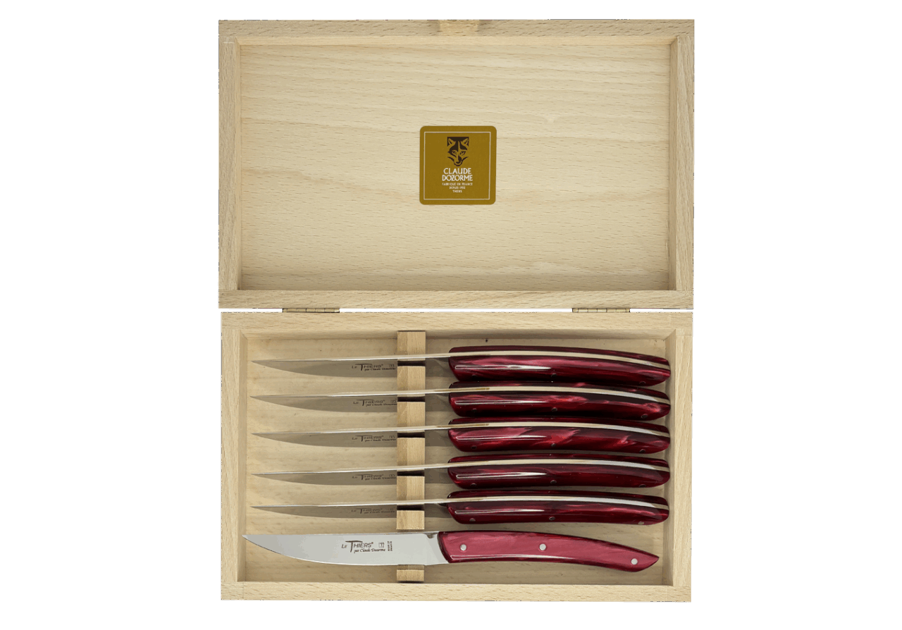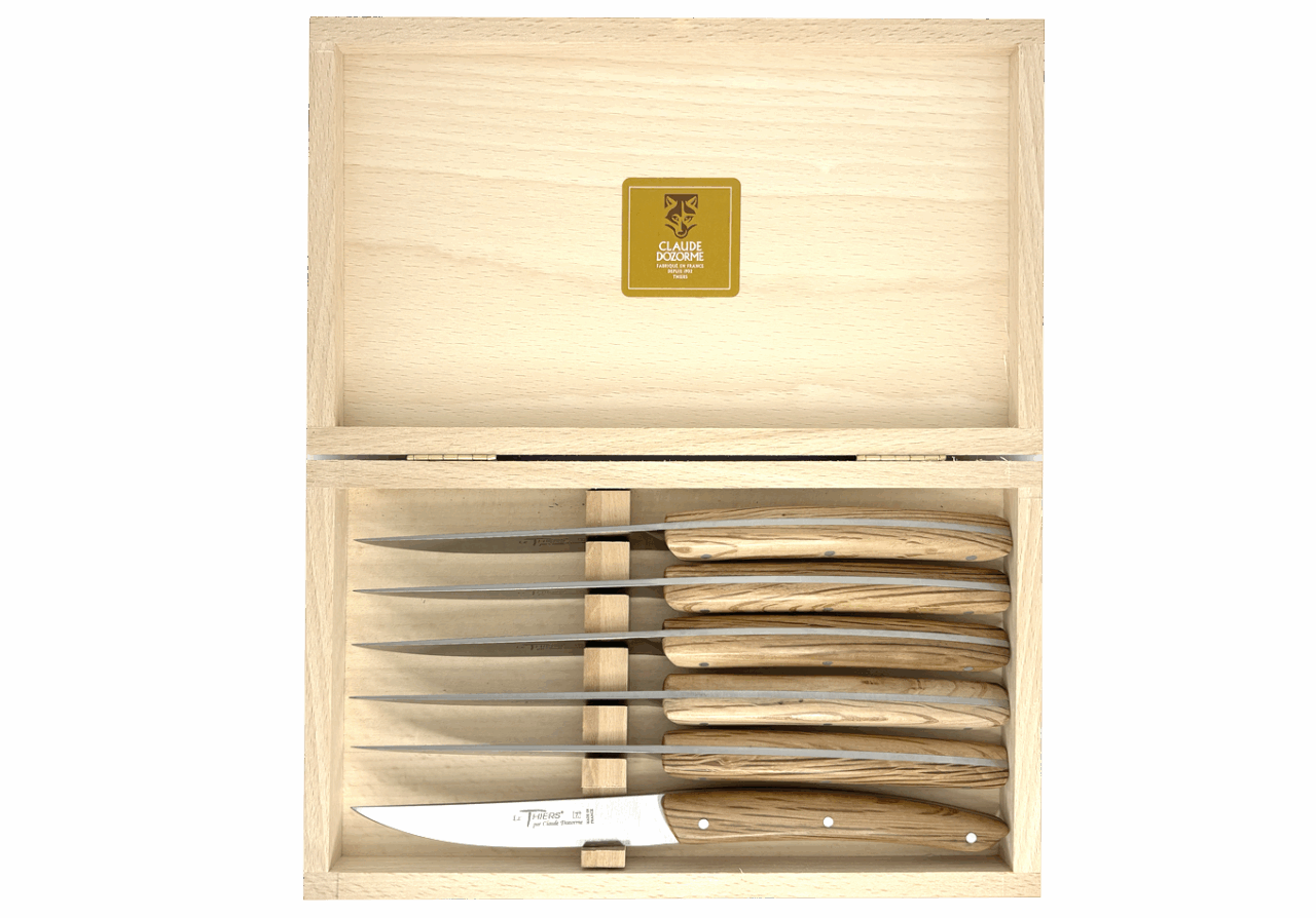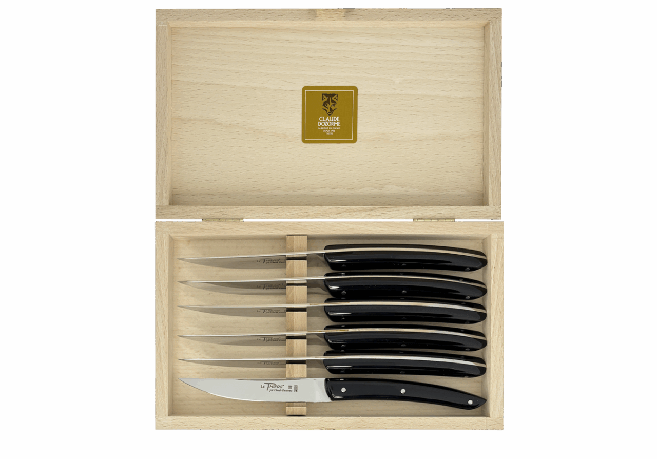 Forme emblématique de la coutellerie thiernoise, Le Thiers® est obligatoirement fabriqué localement. Claude DOZORME l'a décliné avec les codes de la Maison. Lignes fluides, détails épurés, matières nobles et qualité de fabrication, rendent ce couteau incontournable sur les tables contemporaines.