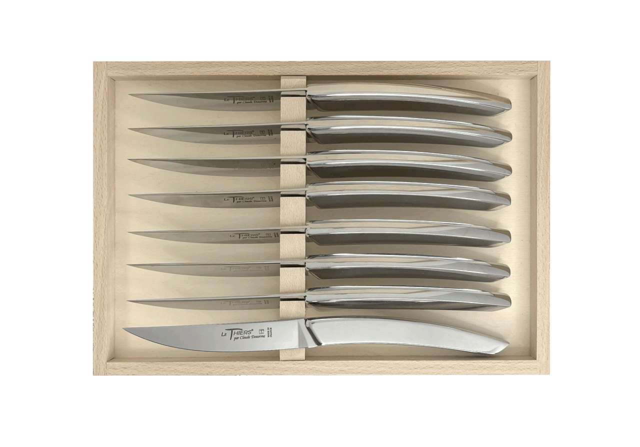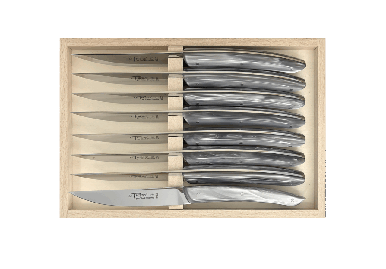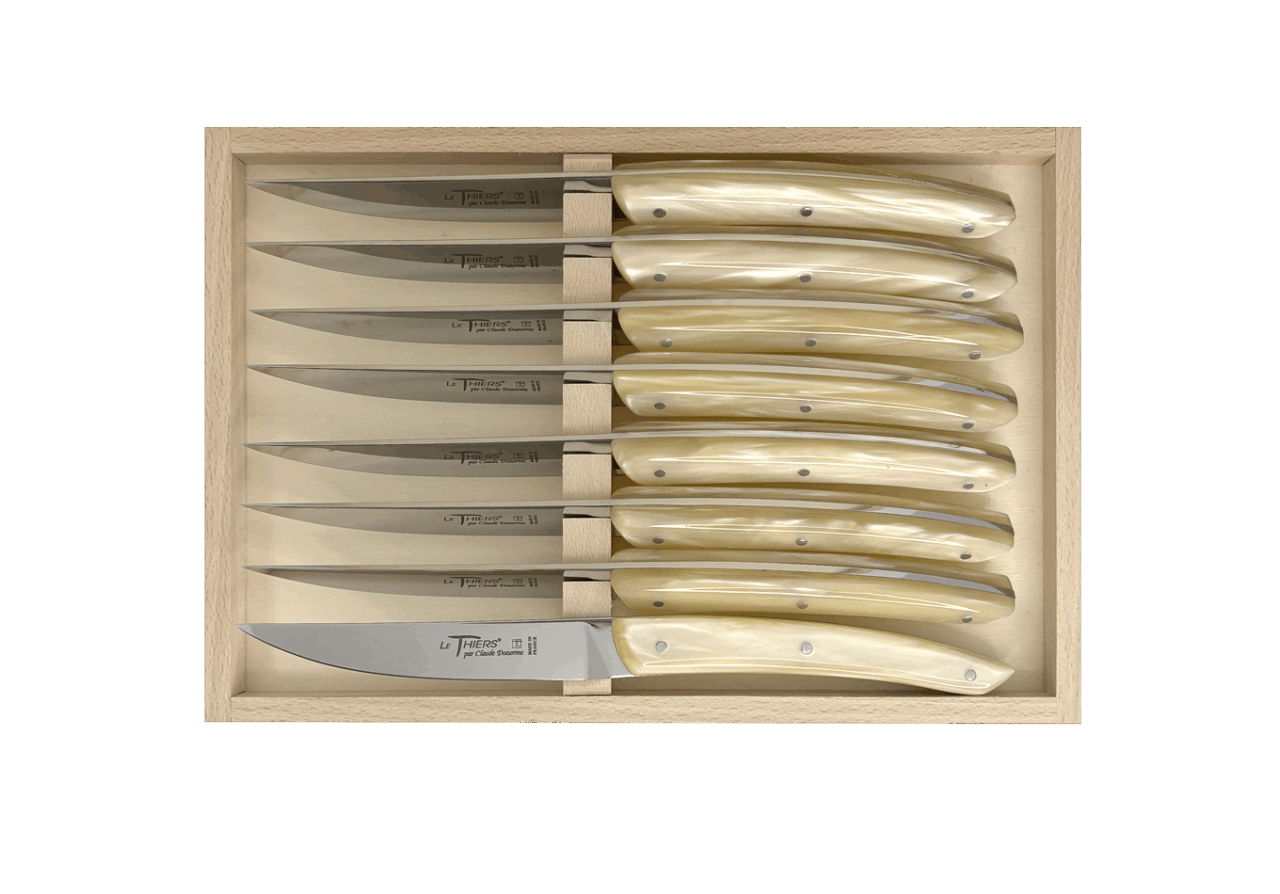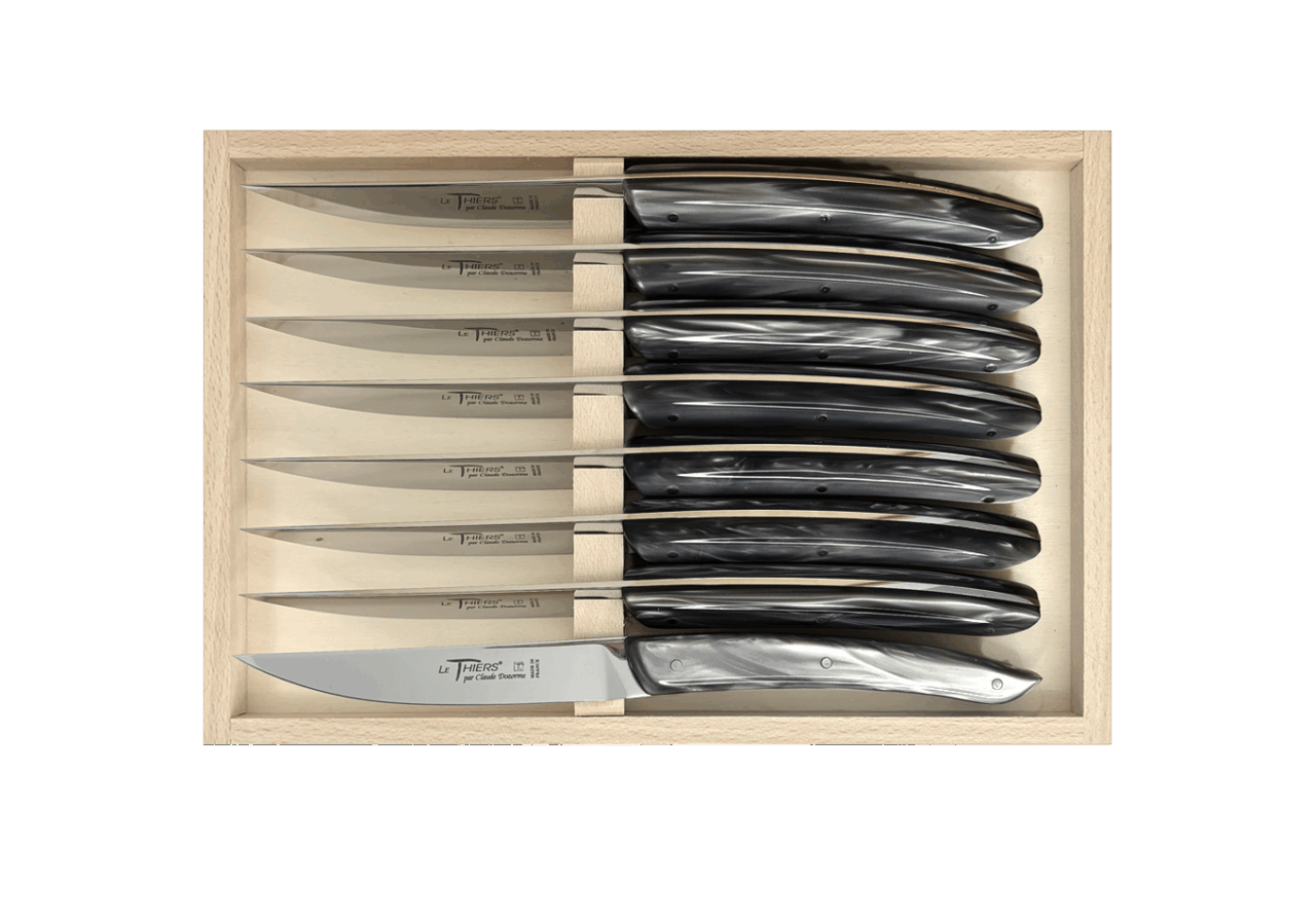 Forme emblématique de la coutellerie thiernoise, Le Thiers® est obligatoirement fabriqué localement. Claude DOZORME l'a décliné avec les codes de la Maison. Lignes fluides, détails épurés, matières nobles et qualité de fabrication, rendent ce couteau incontournable sur les tables contemporaines.