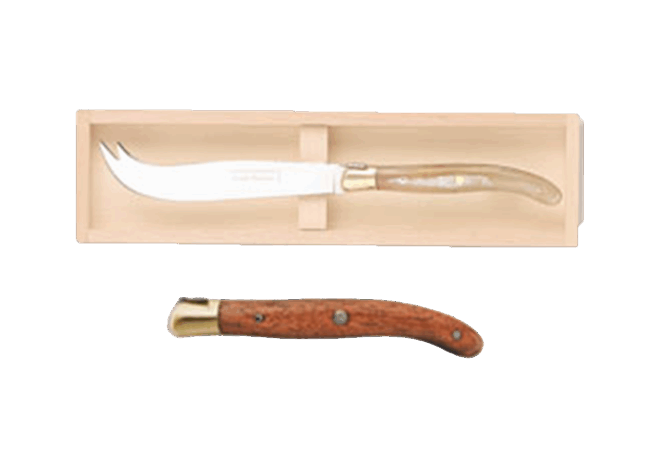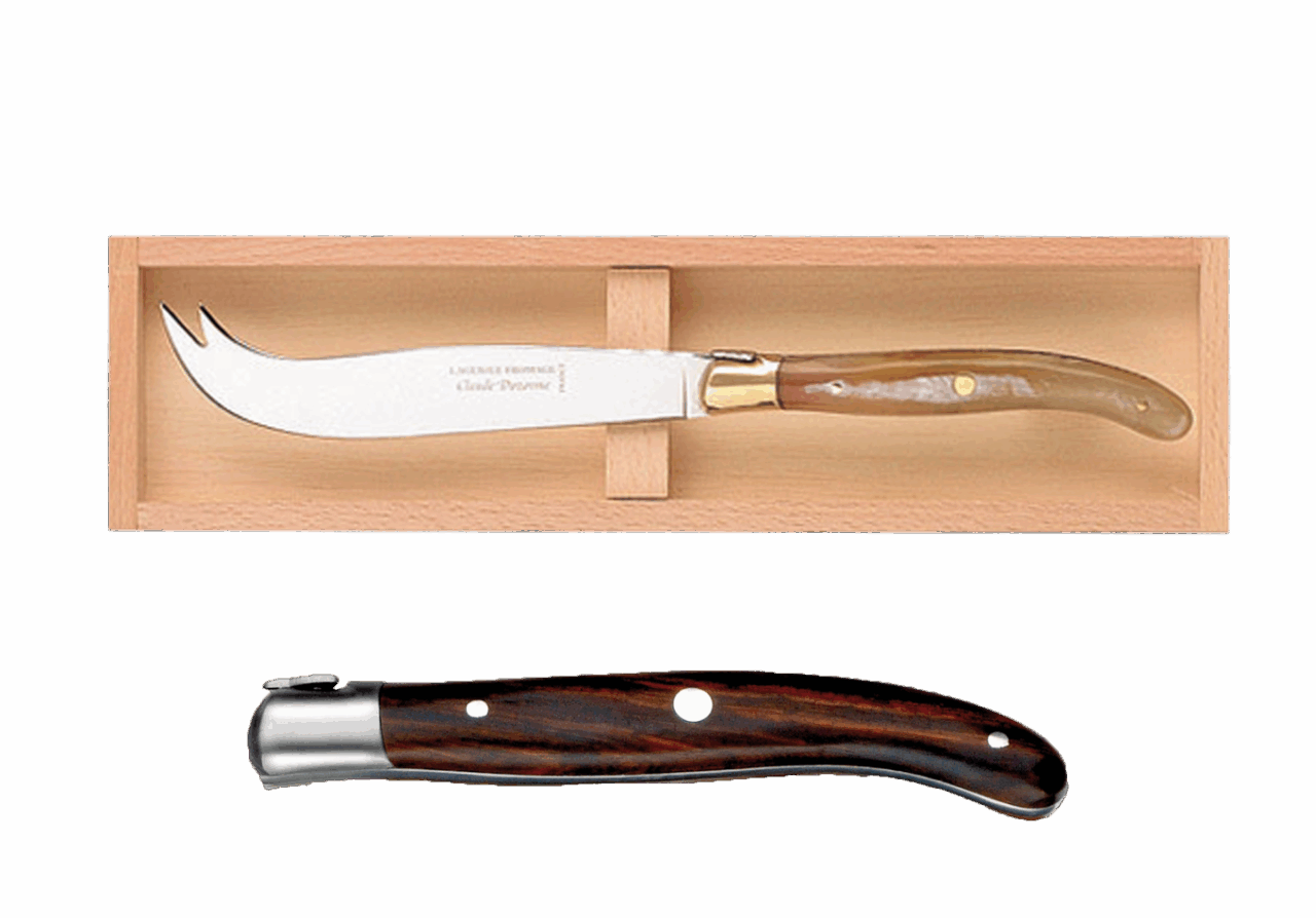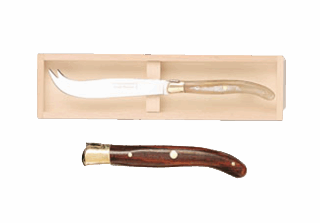 Disponible en manche bois, ivoirine, inox et corne.