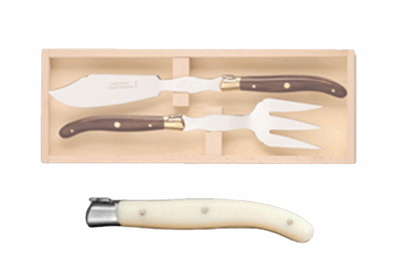 Disponible en manche bois, ivoirine, inox et corne.