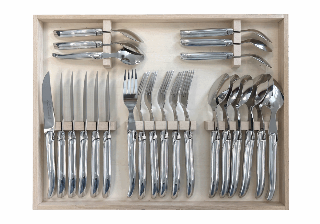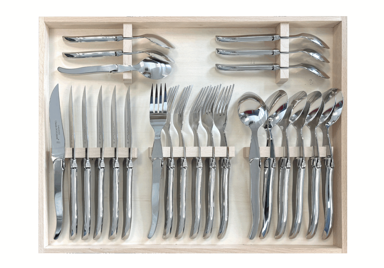 Accompagné par la fourchette, la cuillère à soupe et la cuillère à café Laguiole, cette ménagère de couverts habillera vos tables.