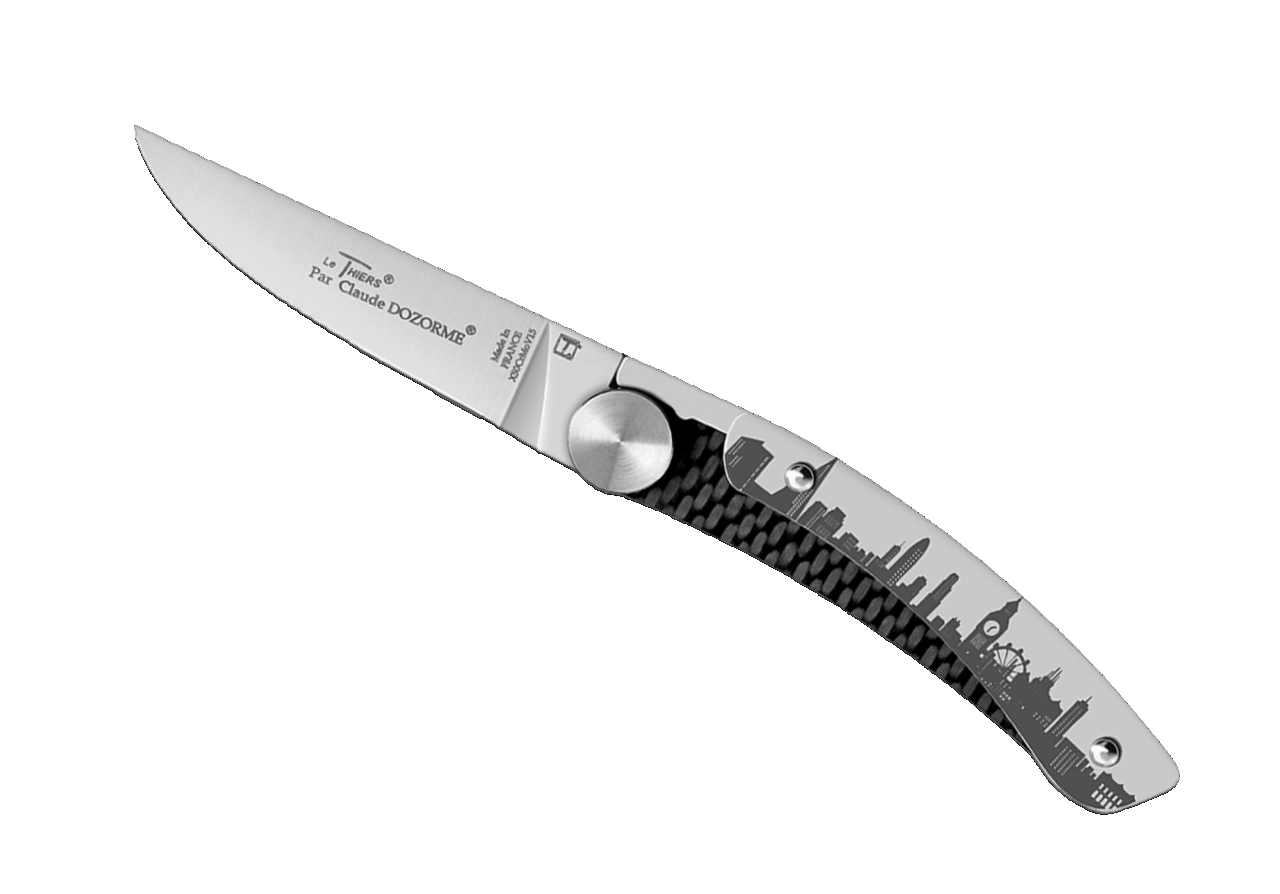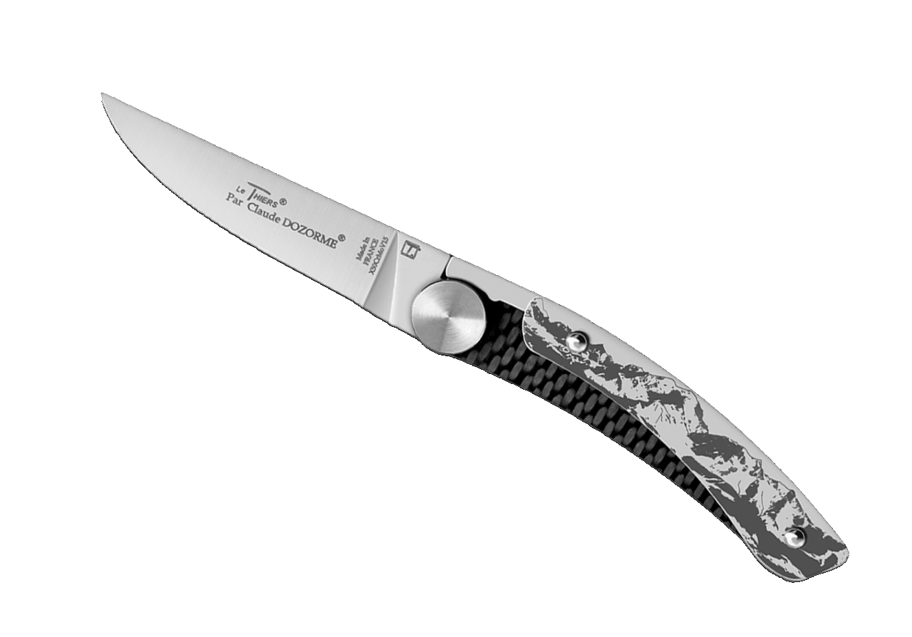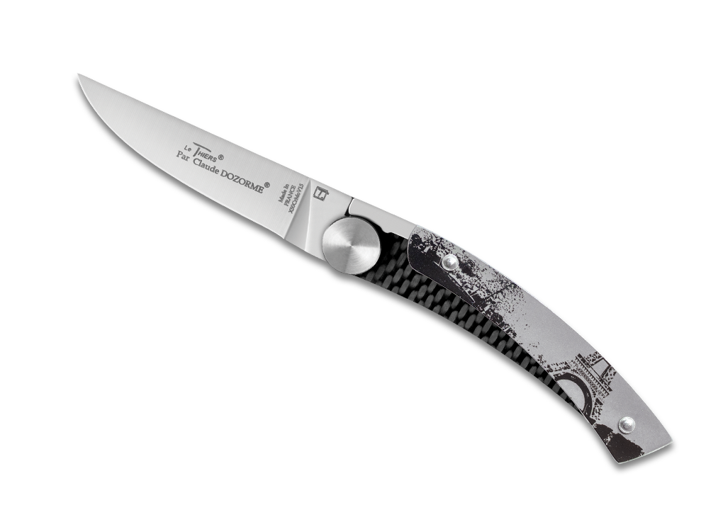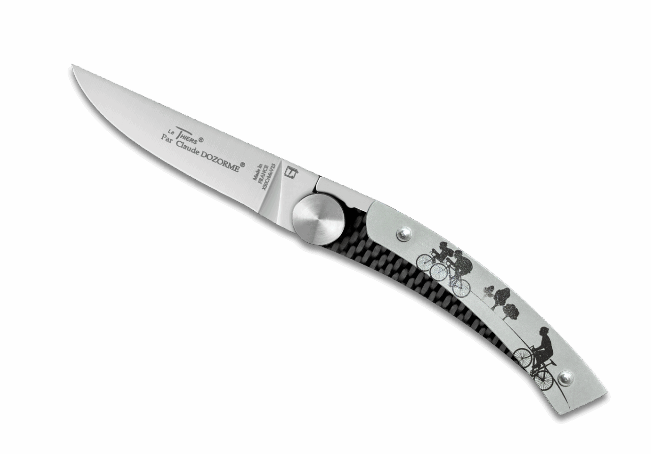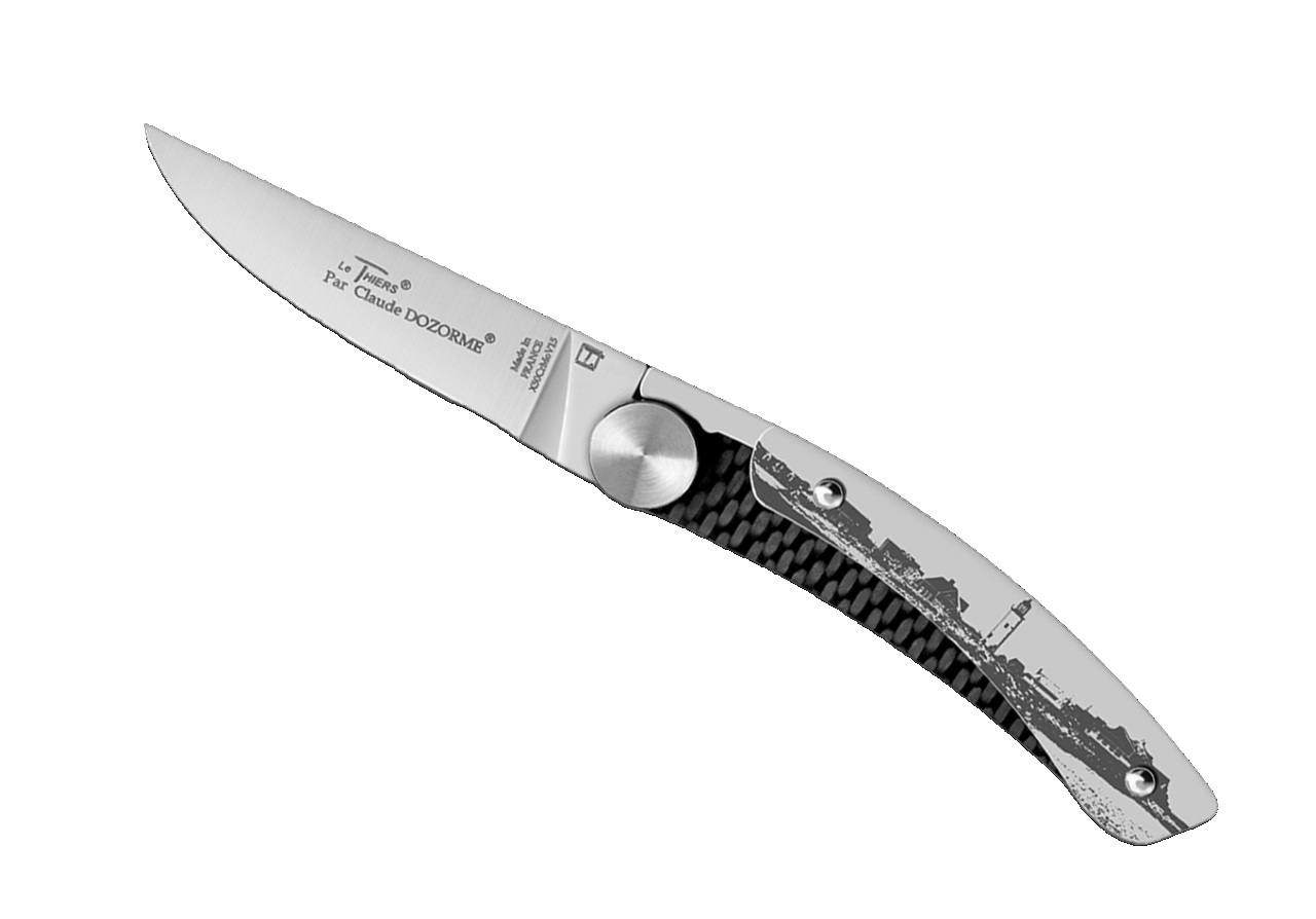 Le Thiers® JERO est un couteau pliant à cran plat, composé d'un manche carbone et d'une lame en acier inoxydable montée sur un axe. Ce couteau de poche moderne et léger vous accompagne dans votre vie quotidienne. Son manche est gravé au laser avec des motifs rappelant le sport, la nature ou la ville. Disponible dans un coffret carton bleu,blanc ou rouge, idéal pour offrir ou s'offrir. La lame épaisse - 3 mm - en acier très haut de gamme X50CrMoV15 (0,50% de carbone, 15% de chrome, 1% de molybdène et 1% de vanadium) dispose d'un excellent tranchant, d'une grande tenue dans le temps et elle est facilement réaffûtable. Le système de verrouillage est très sécurisant. Fabrication 100 % française dans nos ateliers à Thiers.