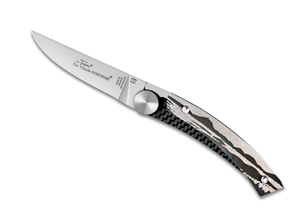 Le Thiers® JERO est un couteau pliant à cran plat, composé d’un manche carbone et d’une lame en acier inoxydable montée sur un axe. Ce couteau de poche moderne et léger vous accompagne dans votre vie quotidienne. Son manche est gravé au laser avec des motifs rappelant le sport, la nature ou la ville. Disponible dans un coffret carton bleu,blanc ou rouge, idéal pour offrir ou s’offrir. La lame épaisse – 3 mm – en acier très haut de gamme X50CrMoV15 (0,50% de carbone, 15% de chrome, 1% de molybdène et 1% de vanadium) dispose d’un excellent tranchant, d’une grande tenue dans le temps et elle est facilement réaffûtable. Le système de verrouillage est très sécurisant. Fabrication 100 % française dans nos ateliers à Thiers.