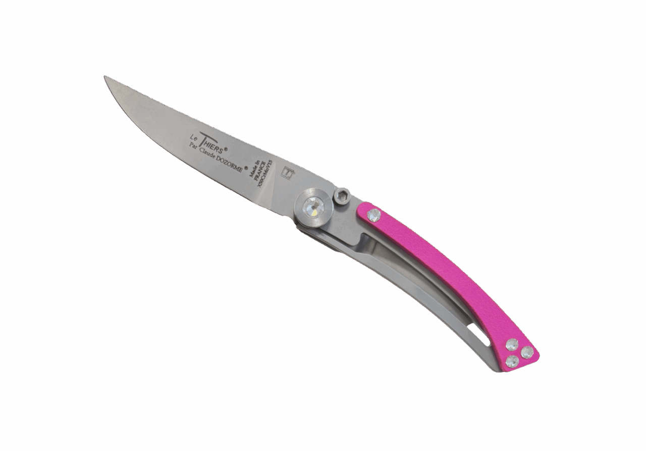 Ce couteau de poche aux courbes féminines, moderne et léger vous accompagne dans votre vie quotidienne. Son manche de couleur et son axe sont ornés de brillants.