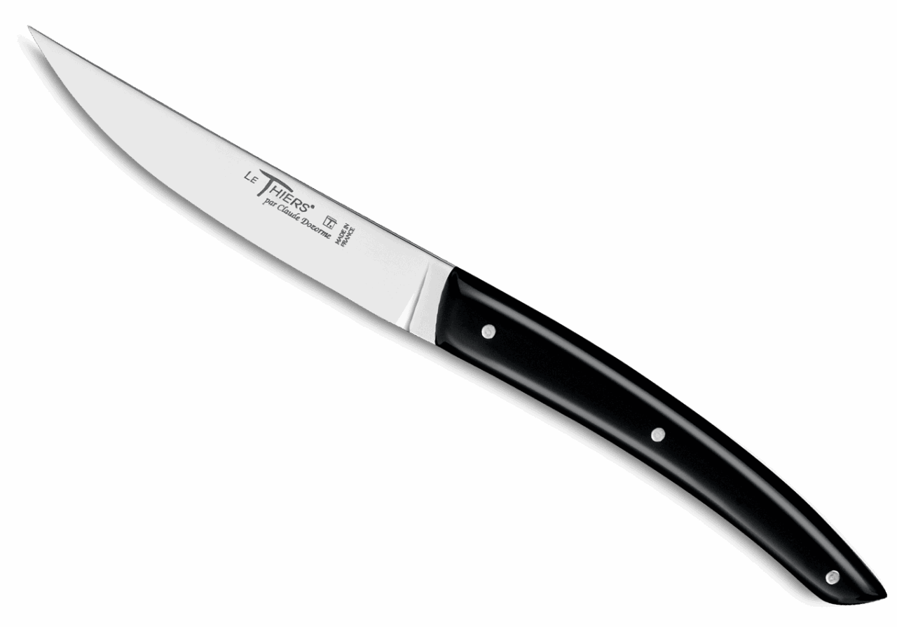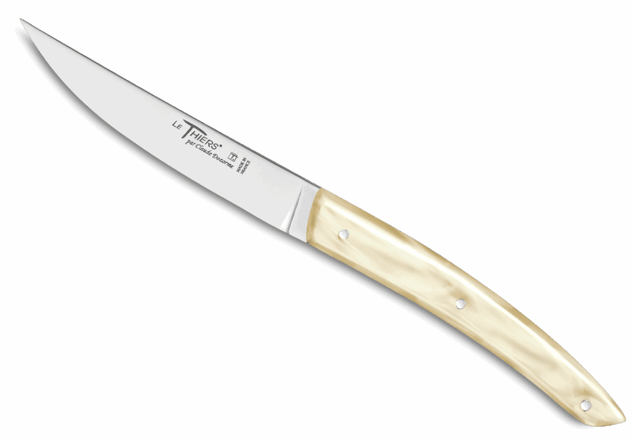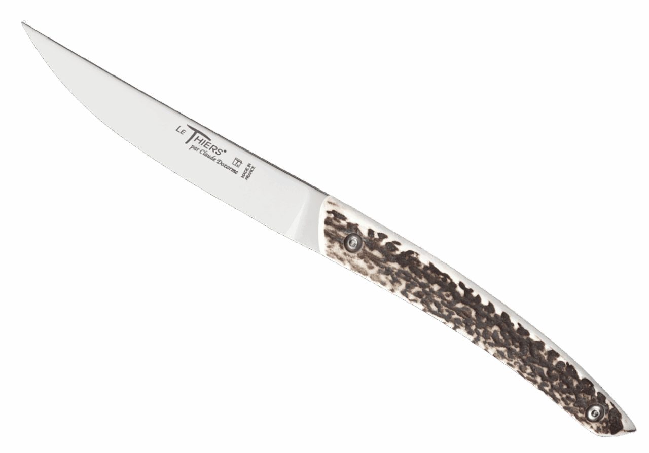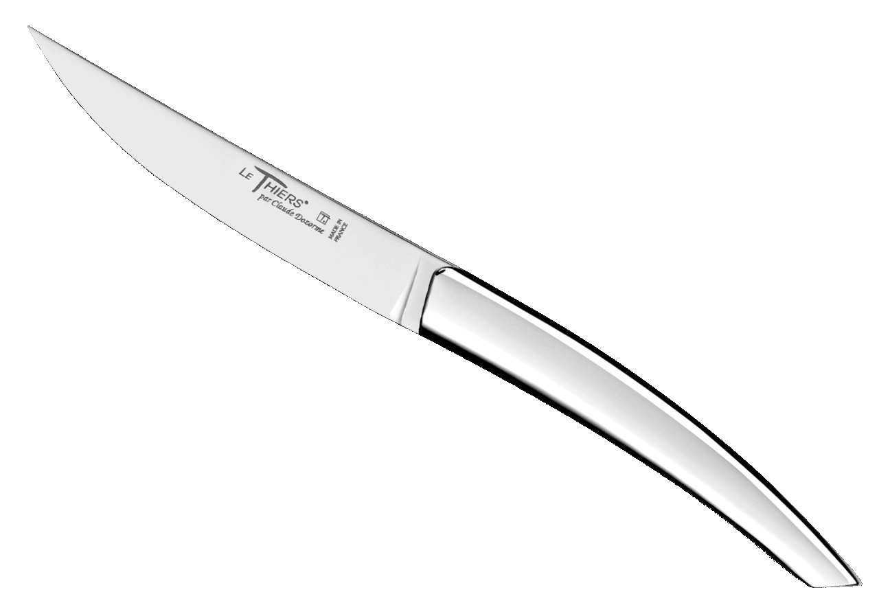 Forme emblématique de la coutellerie thiernoise, Le Thiers® est obligatoirement fabriqué localement. Claude DOZORME l'a décliné avec les codes de la Maison. Lignes fluides, détails épurés, matières nobles et qualité de fabrication, rendent ce couteau incontournable sur les tables contemporaines.